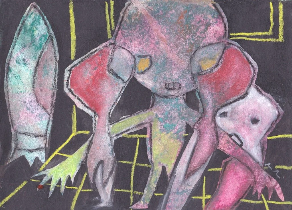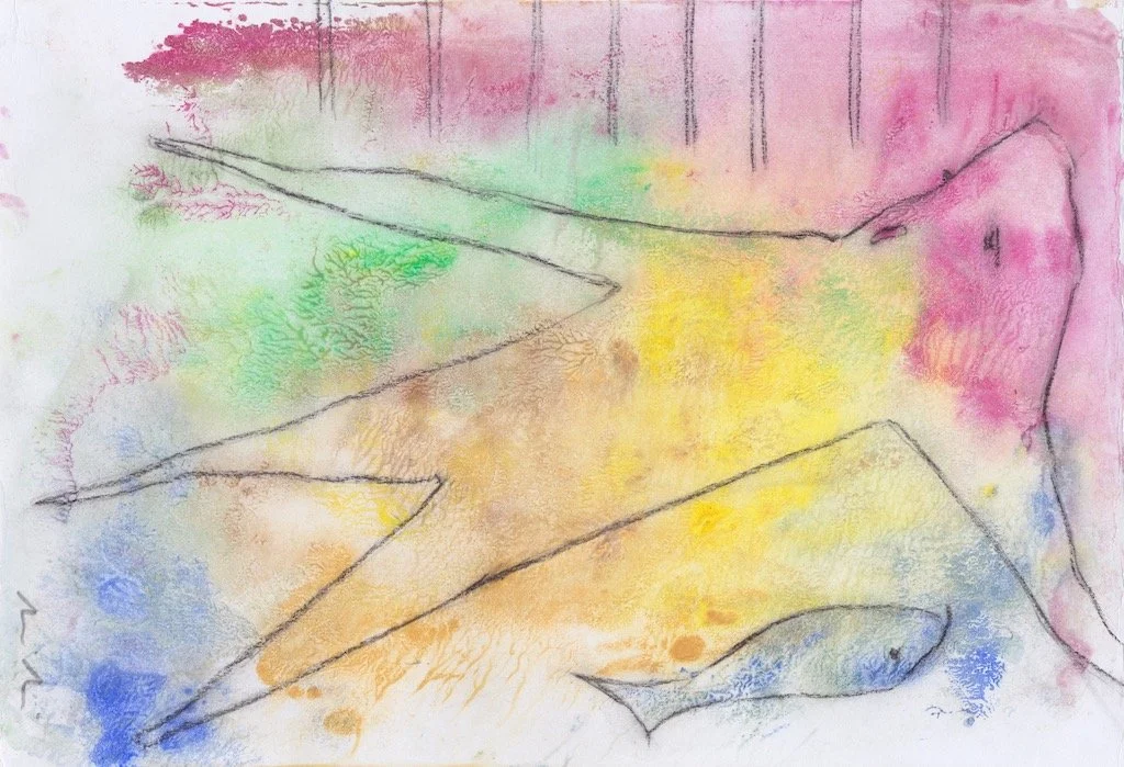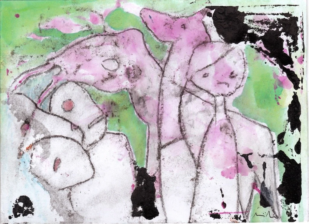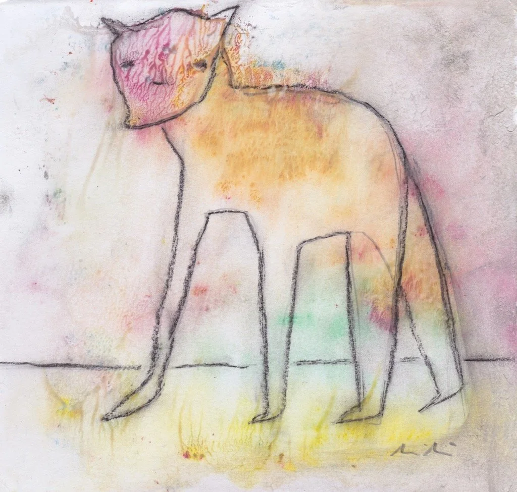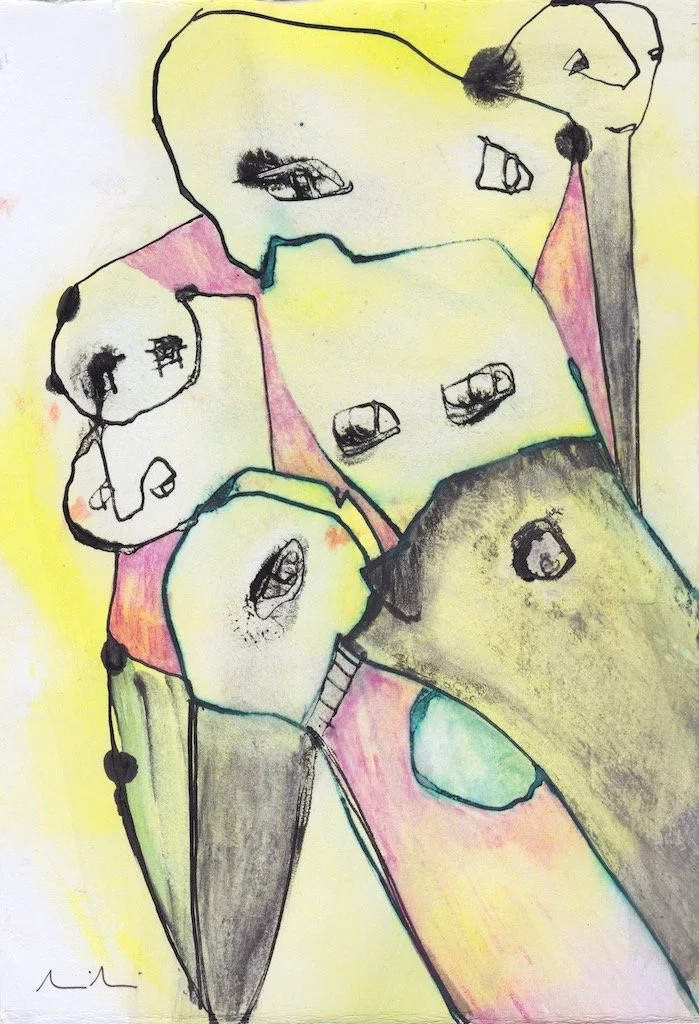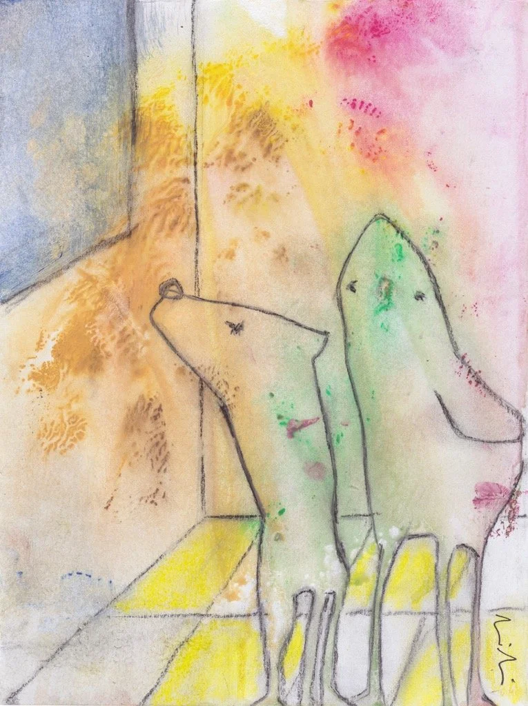 La línea, frágil y temblorosa… parece flotar más que delimitar, como si los contornos pudieran desvanecerse en cualquier momento, aunque el contorno sea grueso en algunos o construido por el fondo.