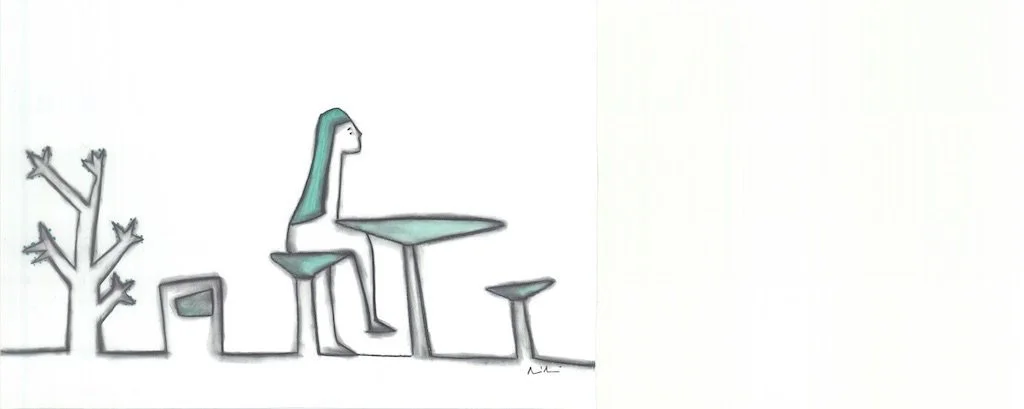 A través de la línea continúa trazo un hilo ininterrumpido entre figura, emoción y espacio. Esta economía compositiva revela más por lo que omite que por lo que muestra, dentro de un espacio en blanco, que actúa como un escenario silencioso, donde cada elemento parece suspendido.